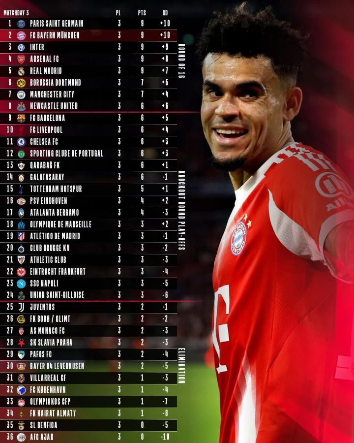 欧冠联赛阶段前三轮比赛结束后,拜仁取得三场全胜,攻入12球,失2球,因进球数略少而暂列第二。目前排名第一的巴黎同样取得三场全胜,攻入13球,失3球。